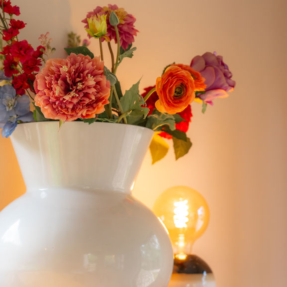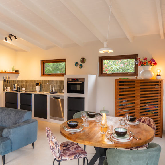 The living room is an open space with French doors and large windows offering views of the green garden with mature trees. It’s furnished with a comfortable sofa, a spacious dining table, ambient lighting, a smart TV with over 1000 (international) channels, and various board games.