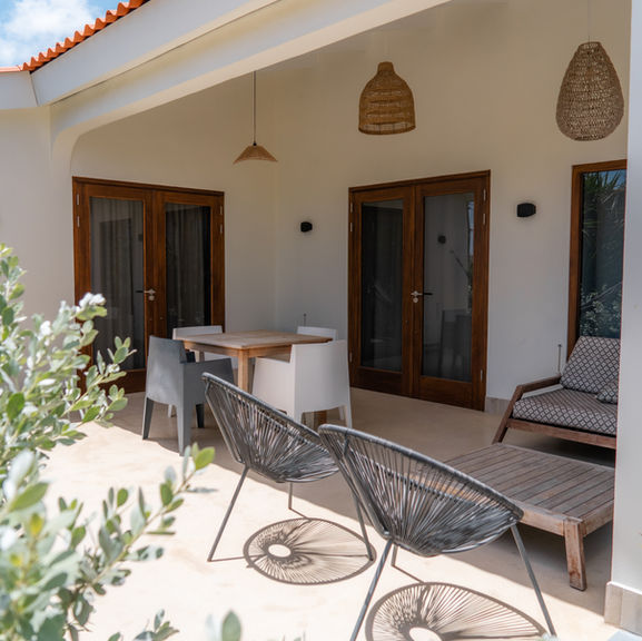 The terrace is accessible via the French doors and offers a view of the tropical garden.