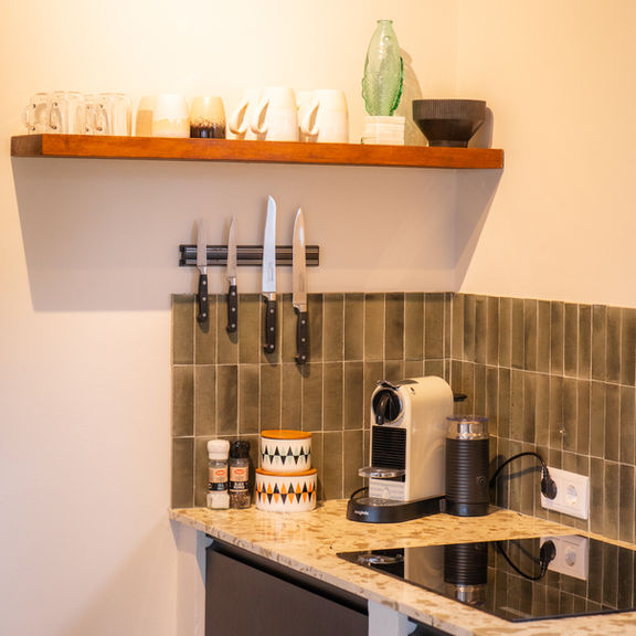 The kitchen is fully equipped with Bosch appliances and has everything you need, including a large fridge with freezer compartment, stovetop, combi-microwave, dishwasher, kettle, Nespresso machine, hand blender, and panini grill.